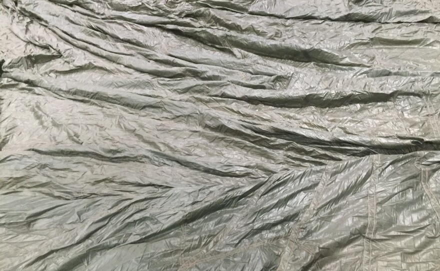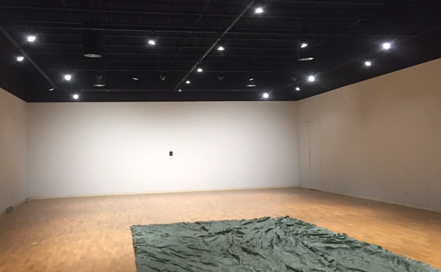 The Merwin Gallery at IWU in Bloomington hosts the latest exhibition from artist Bill Conger. To Open Windows is a spare exhibition that invites an investment of viewer interpretation of the two works on display. Conger was excited by the perfectly symmetrical space of the large gallery, and created a large piece just for the show. It's a large rectangle of mussed green parachute material.